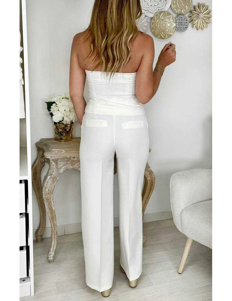 ☆ bustier blanc et boutonné,, deux poches plaquées, il se porte ajusté, prévoir un soutien gorge sans bretelles pour les poitrines les plus menues.