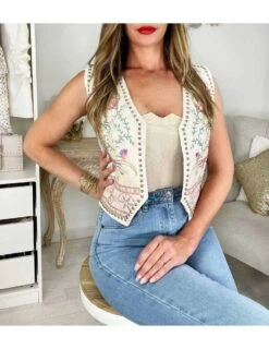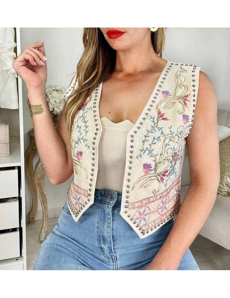 ☆petit gilet sans manches, il se ferme par trois petits crochets, imprimé fleuri et dorures, petits clous sur les contours , il se porte droit.
