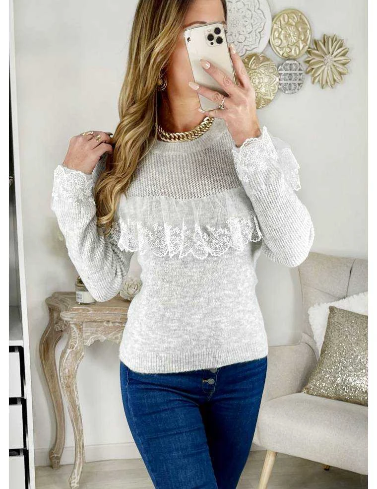 Pull en maille gris clair et fine dentelle blanche sur le buste et les manches, col rond et manche longues, il se porte loose