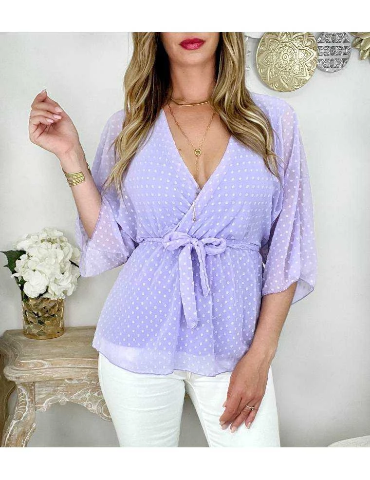 ☆ Petite blouse col cache coeur et nouée, de couleur Lila et plumetis , elle se porte droite.