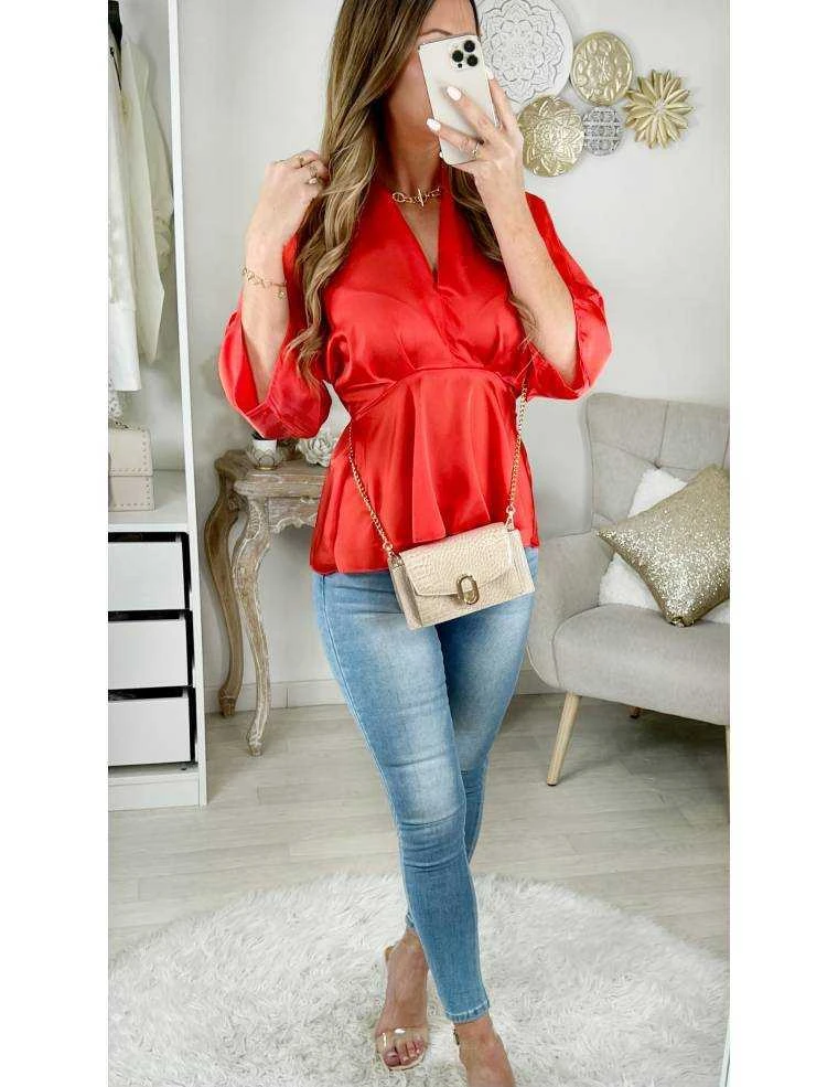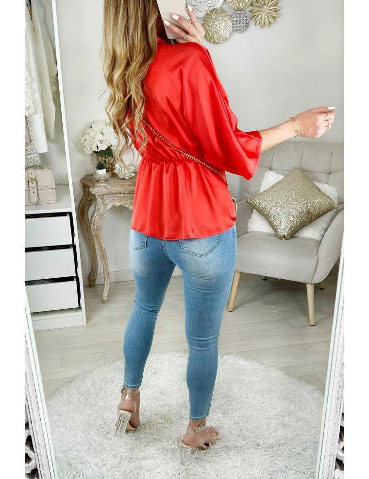 Blouse orange flashy satinée , dos élastiqué, manches 3/4 souris , drapée sur le devant et cache V, elle se porte droite