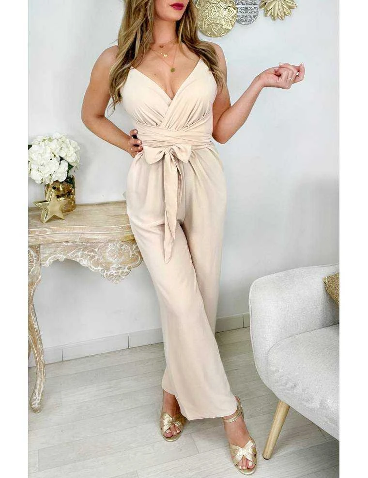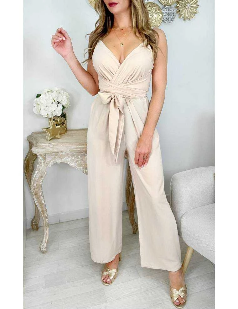 ☆ Combi pantalon fluide beige ,col cache coeur, fines bretelles réglables, longue ceinture à nouer, elle se porte droite.