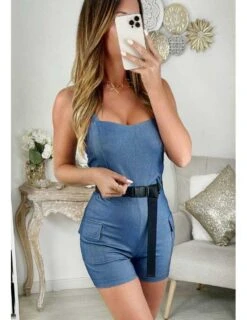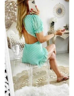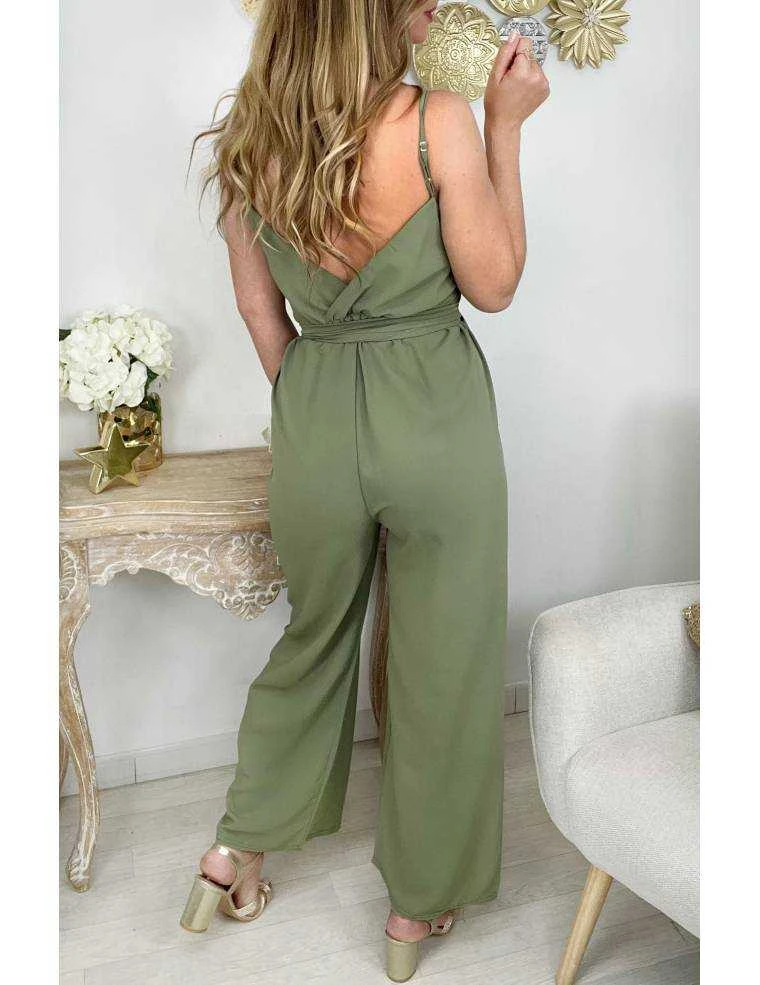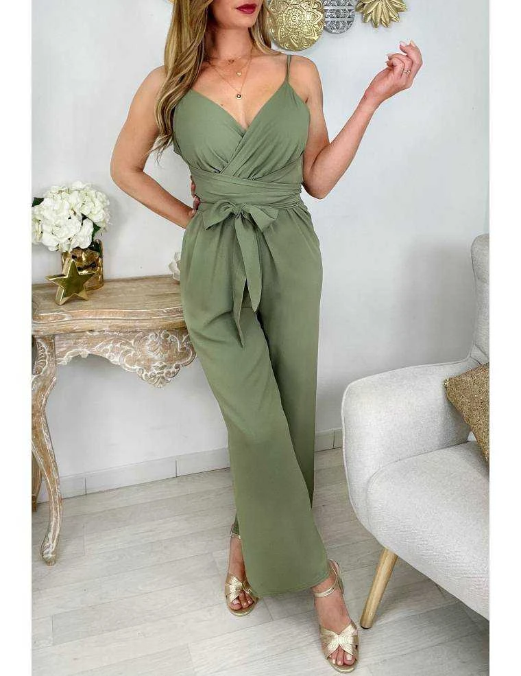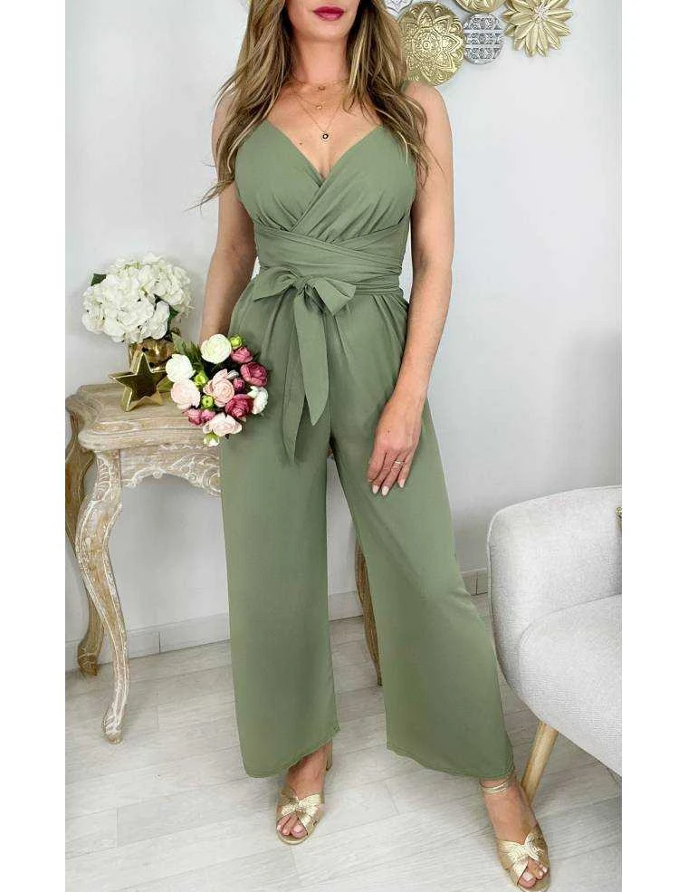 ☆ Combi pantalon fluide vert clair ,col cache coeur, fines bretelles réglables, longue ceinture à nouer, elle se porte droite.