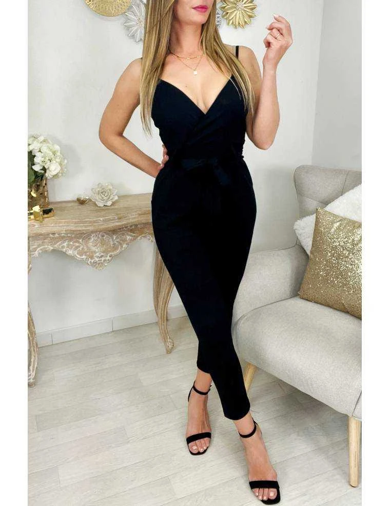 ☆ Combi pantalon noire , col cache coeur et préformes en mousse, fines bretelles non réglables, ceinture à nouer, elle se porte ajustée