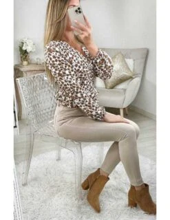 ☆ Blouse au fond blanc et imprimé fleuri choco, col cache coeur noué, petits volants sur le bas, manches longues poignets élastiques , elle se porte droite.