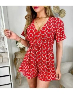 ☆ Combi short au fond rouge et petites feuilles beige, col v, lien à nouer, se ferme par un zip dans le dos,, elle se porte droite.