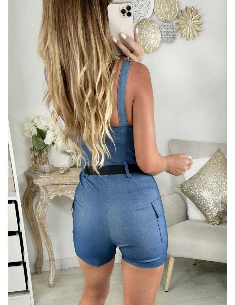 ☆ Combi short style jeans et stretch, bretelles non réglables, ceinture noire à clipser , préformes en mousse, deux poches sur les cotés.