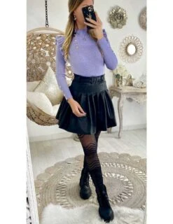 Jupe noire en tissu style cuir, style patineuse, faux plis sur le haut et ceinture à boucle, elle se ferme par un zip invisible sur le côté et se porte ajustée.