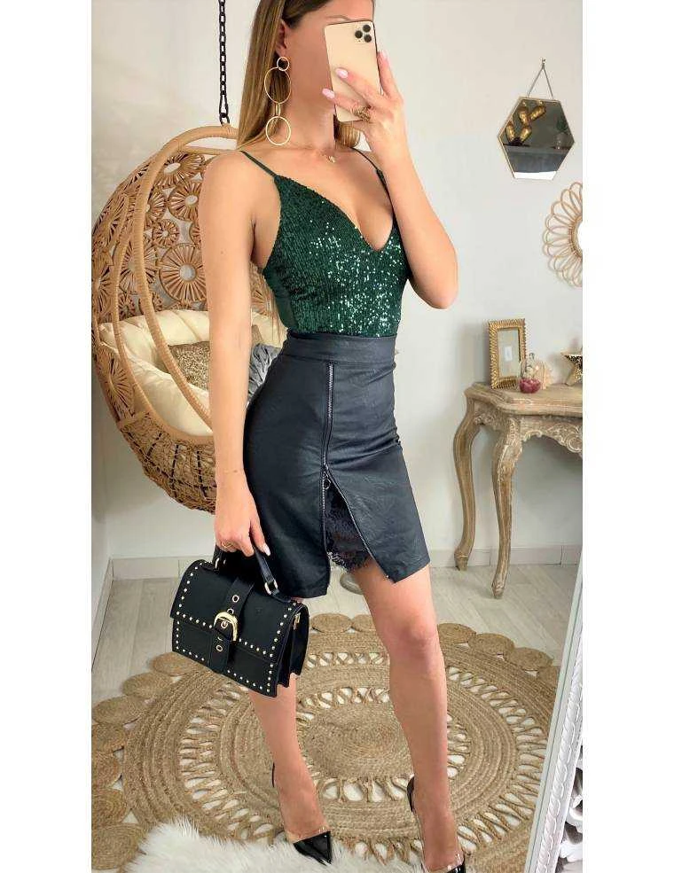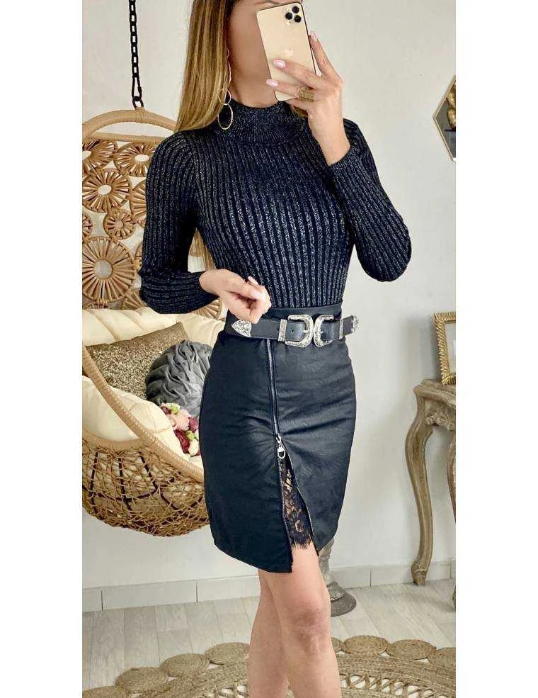 Jupe noire en tissu style cuir, elle est zippée sur l’avant de haut en bas et laisse apparaitre un empiècement en dentelle sous ce zip, elle se porte droite et taille haute et se ferme avec un petit zip à l’arrière.