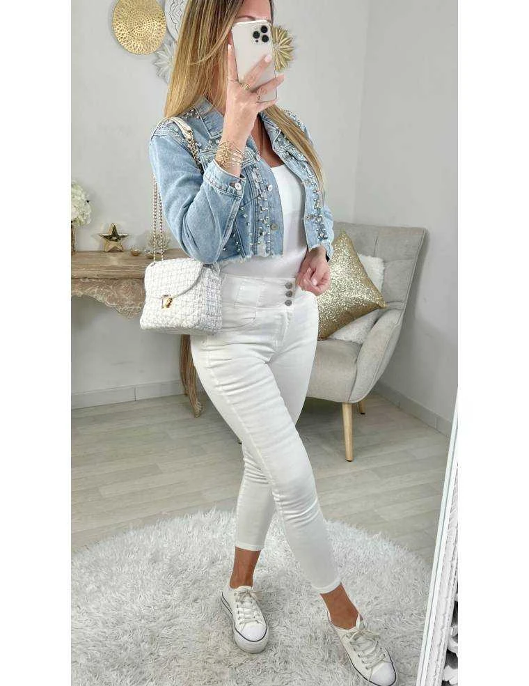 ☆ Veste bleu ciel en jeans, se ferme par quatre boutons, deux poches sur le buste et coutures « used », strass et clous sur le devant, elle se porte droite.