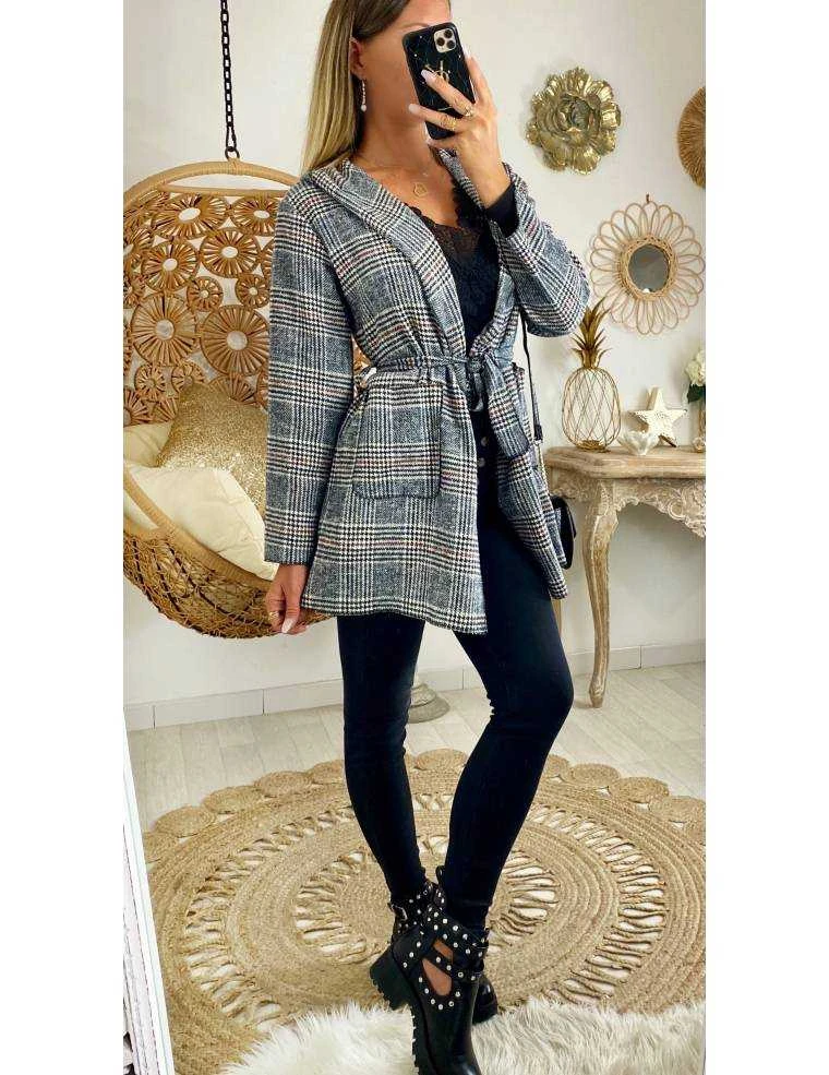 Veste légère à capuche loose à carreaux noirs et fines rayures rouges , manches longues,et ceinture à nouer , il se porte ample.