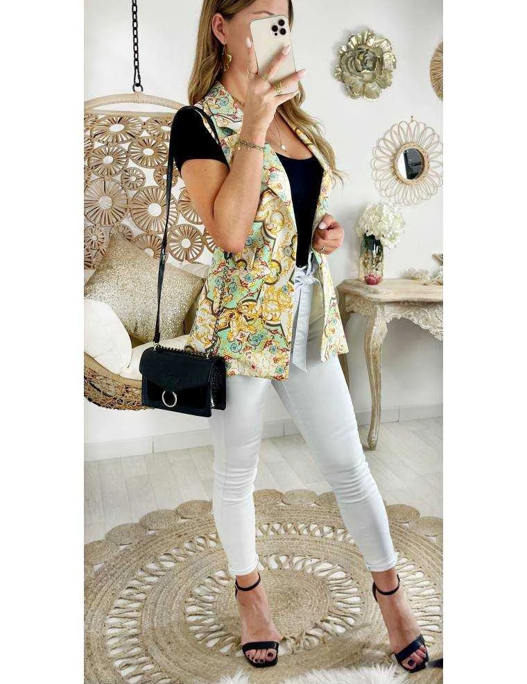 Blazer sans manches vert d’eau imprimé « couture », 2 poches et joli col, il se porte ouvert et droit.