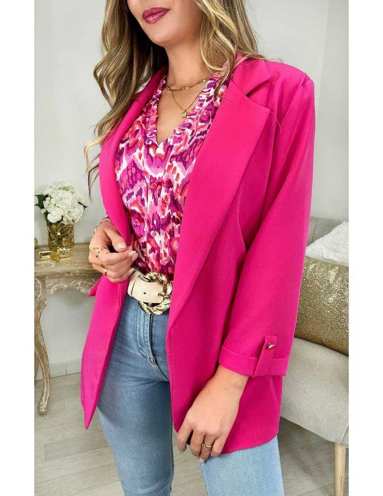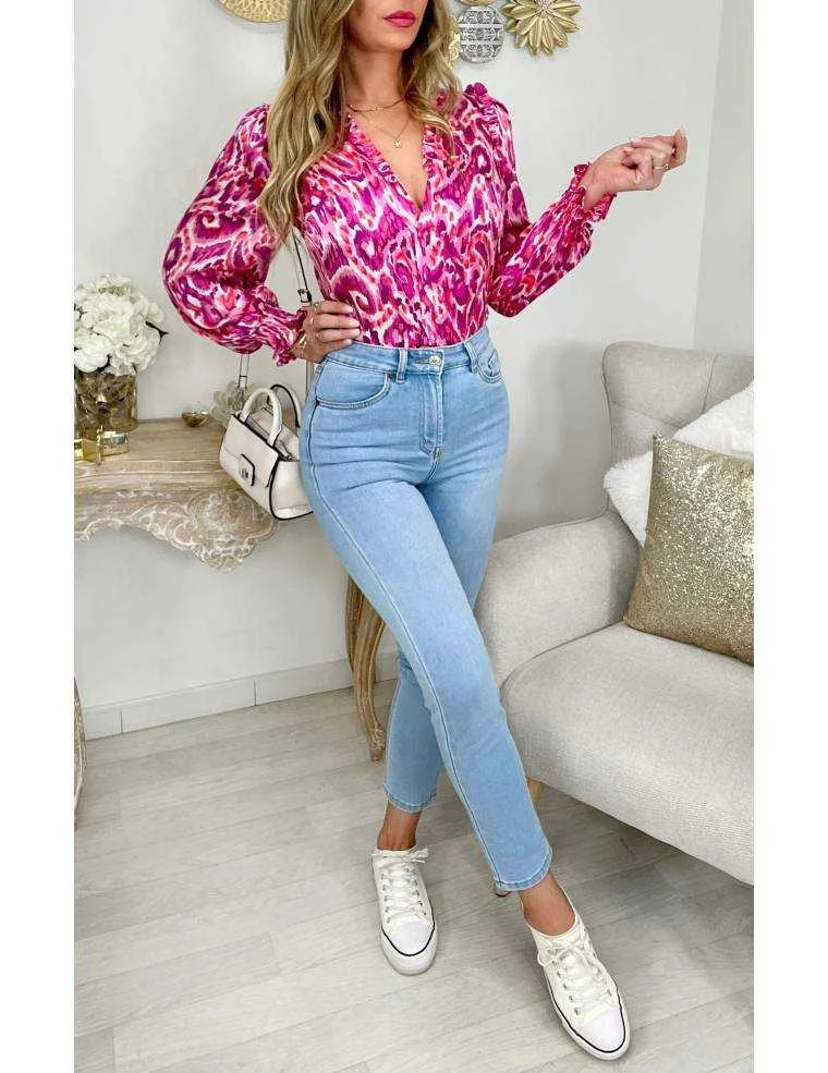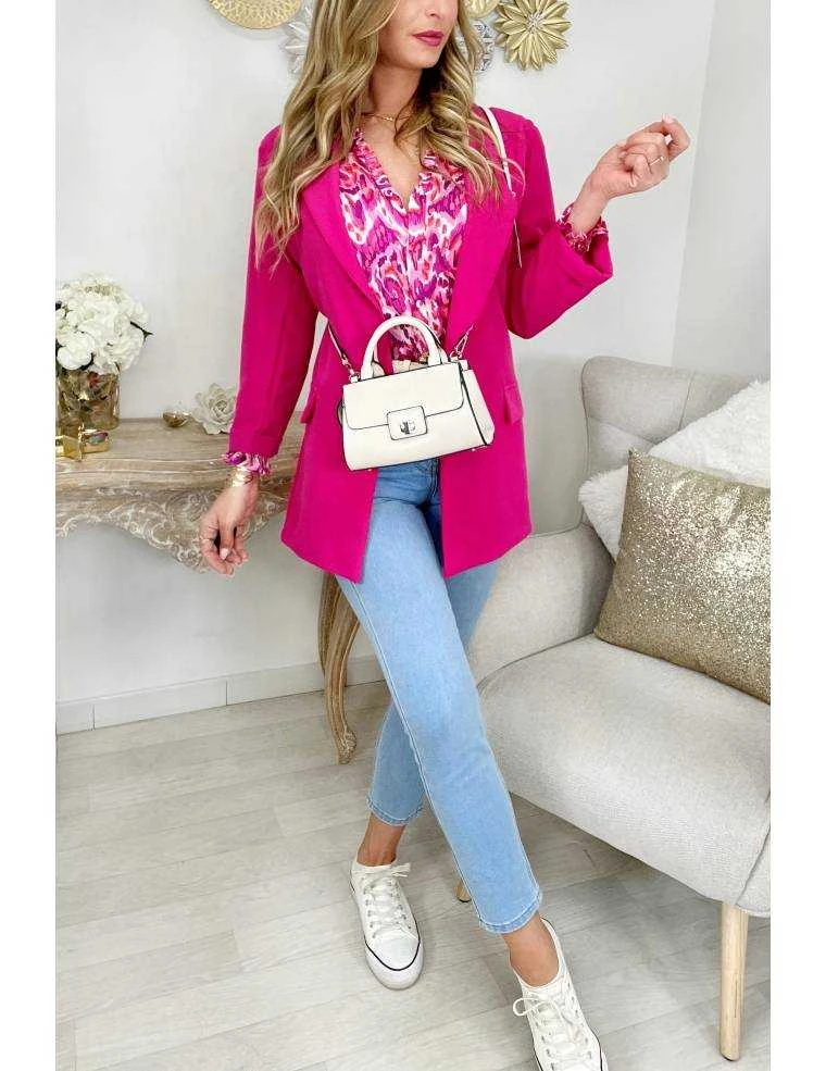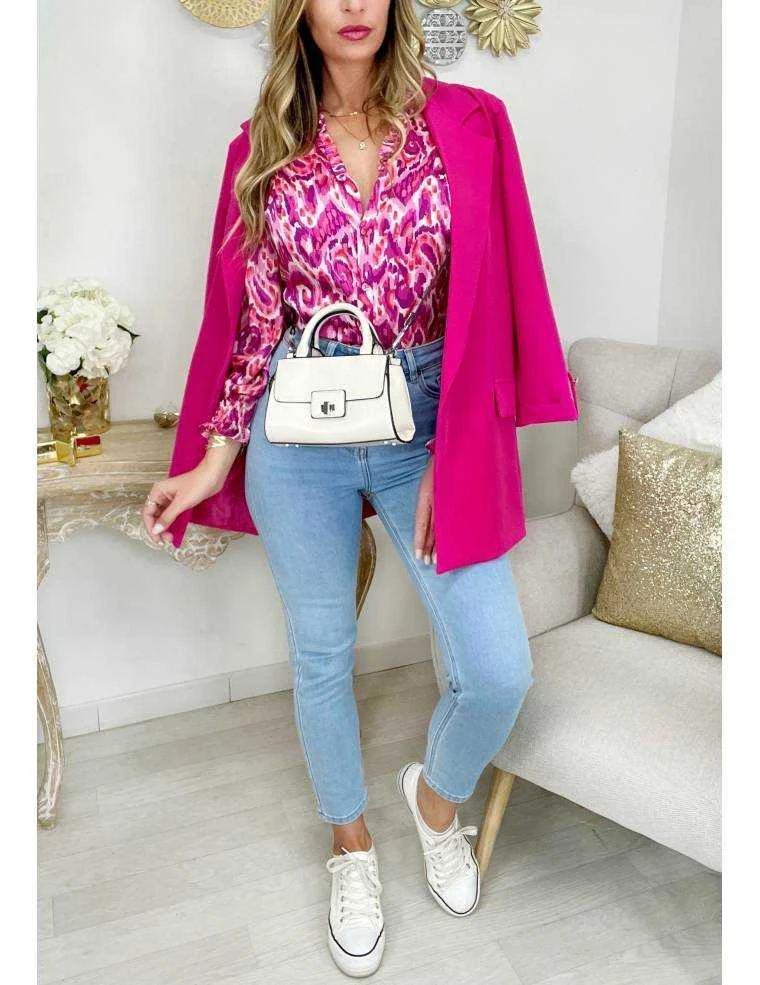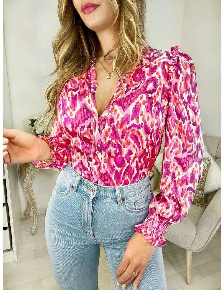 ☆ Chemisier satiné dans les tons rose fuchsia et purple ,entièrement boutonné, petits volants au col et sur les épaules,il se porte droit, noué,ou plus ajusté à l’intérieur d’un pantalon ou d’une jupe.