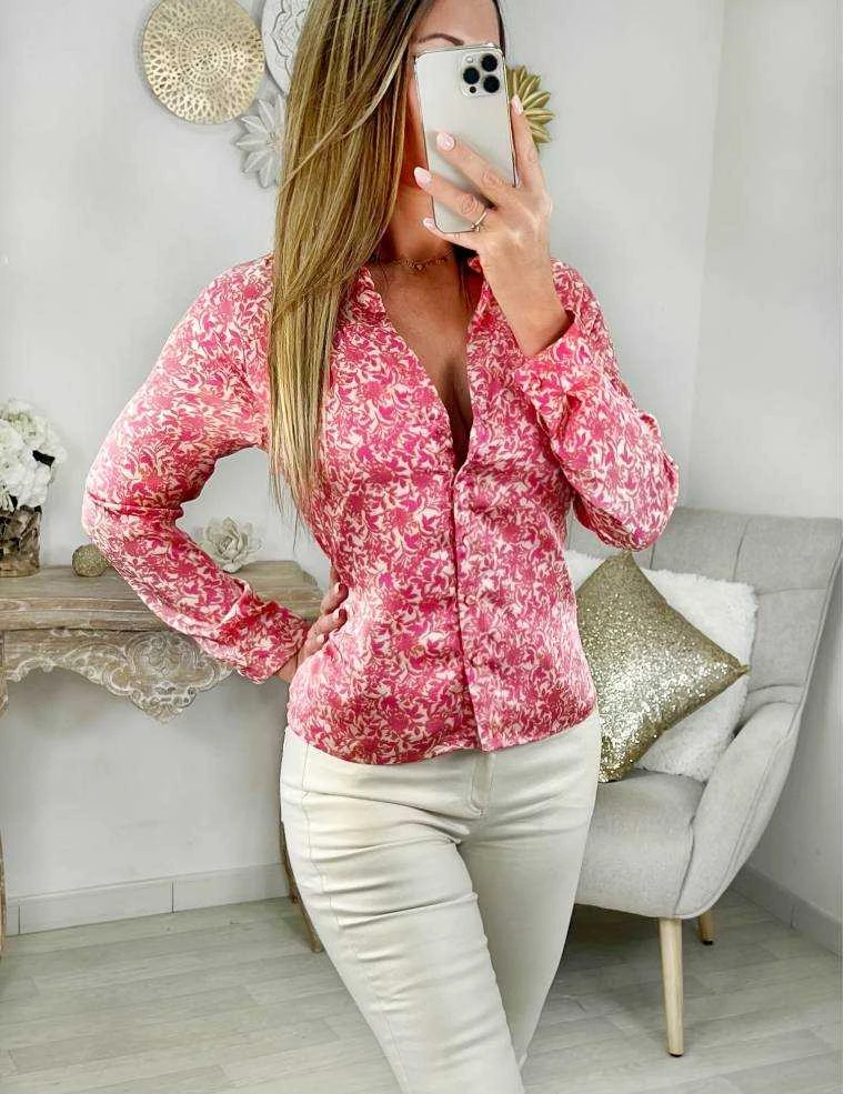 ☆ Chemisier à l’imprimé » feuilles » roses, petits volants sur le col, entièrement boutonné, il se porte droit ou plus ajusté à l’intérieur d’un pantalon ou d’une jupe.