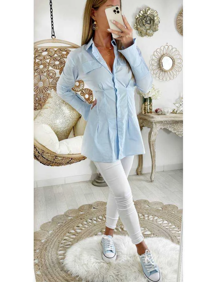 Chemisier long bleu ciel, entièrement boutonné, taille marquée, manches longues se fermant par deux boutons et volants sur les poignets , il se porte ajusté.