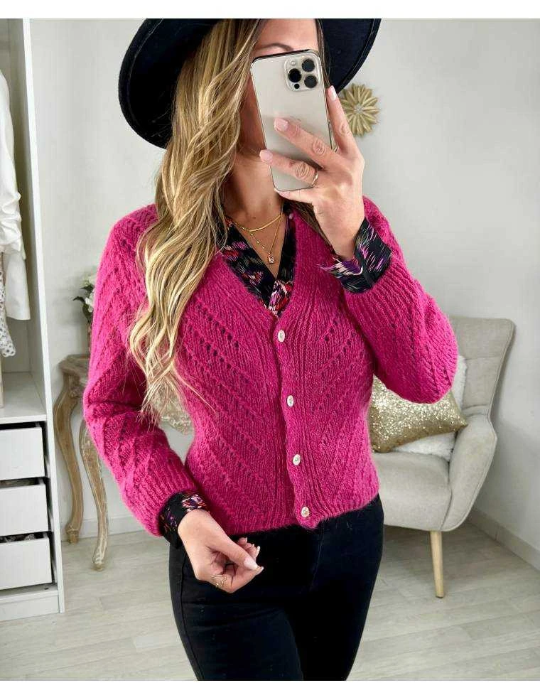 ☆ Gilet en lainage fuchsia, ajouré, se ferme par quatre boutons, il se porte droit.