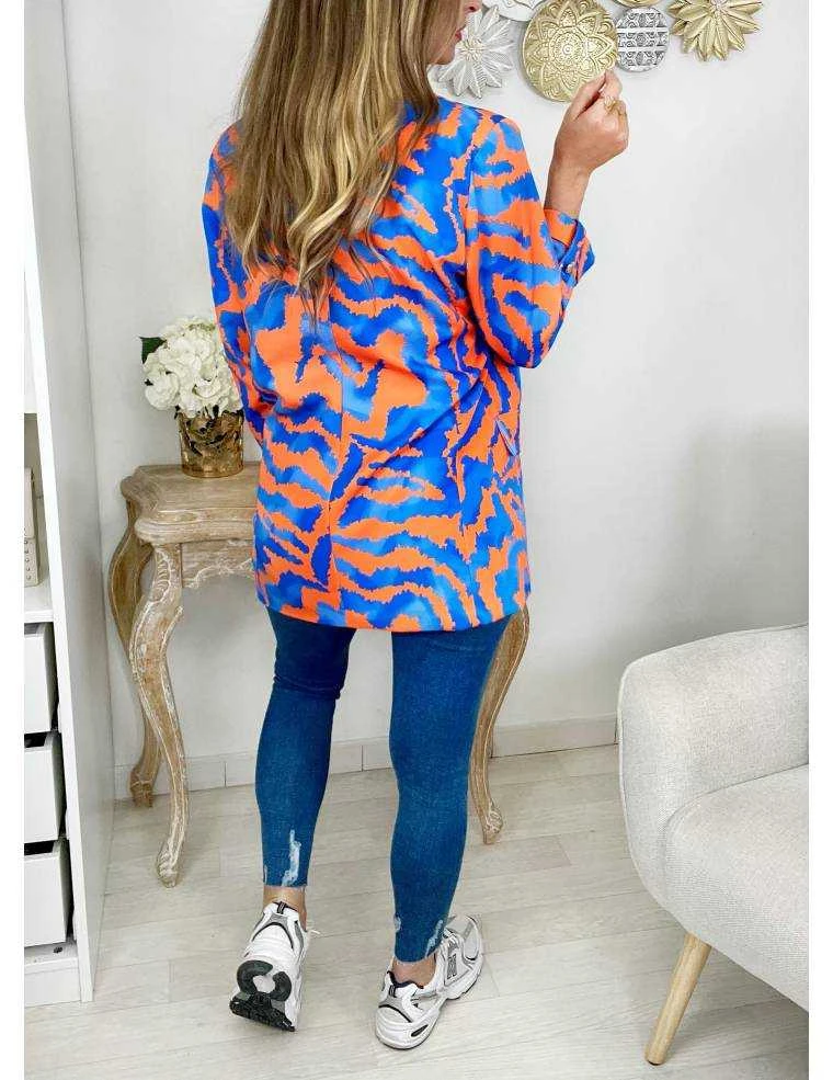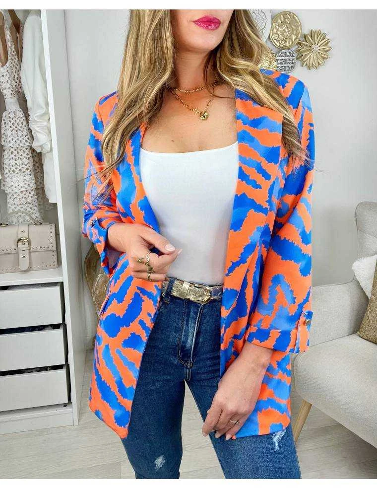 ☆ Blazer dans les coloris orange et bleu doublé, col droit, boutons dorés aux poignets.