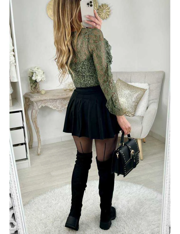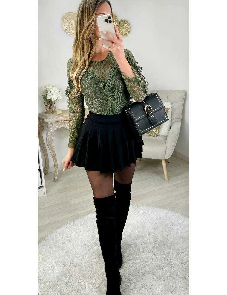 ☆ Body kaki , col V , buste et manches en dentelle, il se ferme par un zip à l’arrière, il se ferme par deux pressions et il se porte ajusté.