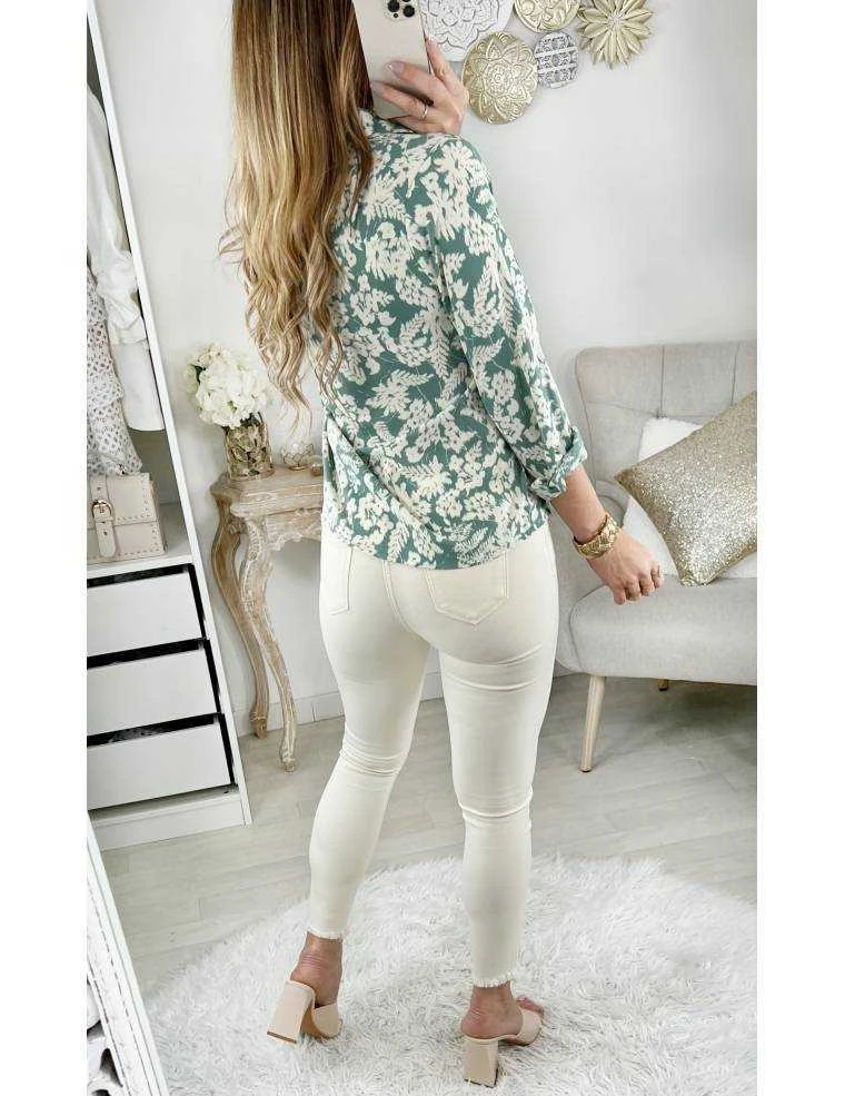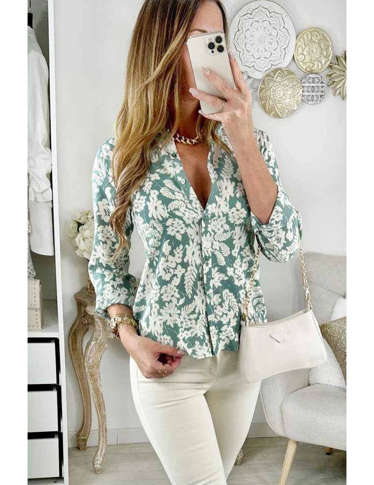 Chemisier au fond vert d’eau boutonné imprimé fleuri, manches longues et il se porte droit.