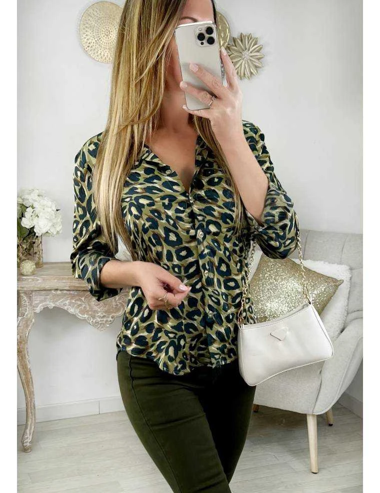 ☆ chemisier fluide à l’imprimé kaki léo, entièrement boutonné, il se porte droit.