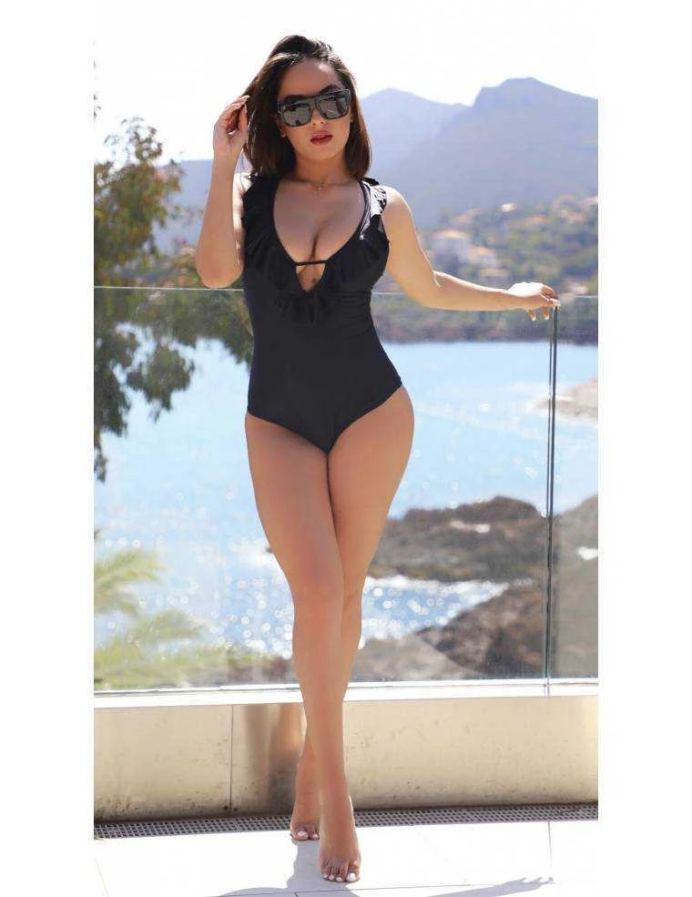 Maillot de bain une pièce noir avec volants sur décolleté plongeant, bretelles croisés et échancrure au dos, préformes en mousse