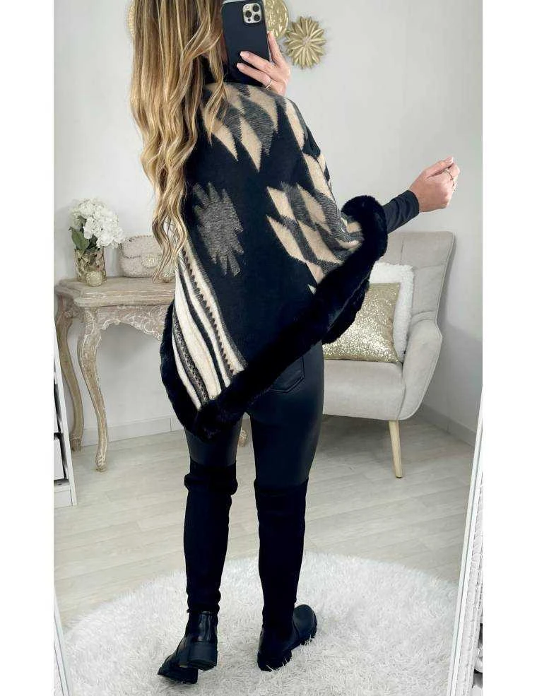 ☆ Poncho en lainage, caramel et noir, col et bords en fourrure synthétique