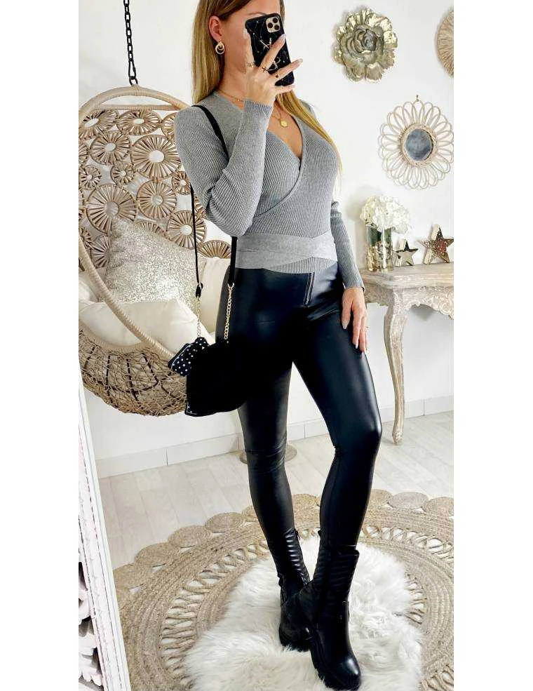 Petit pull gris cache coeur en maille côtelée, manches longues,et lien à nouer il se porte ajusté.
