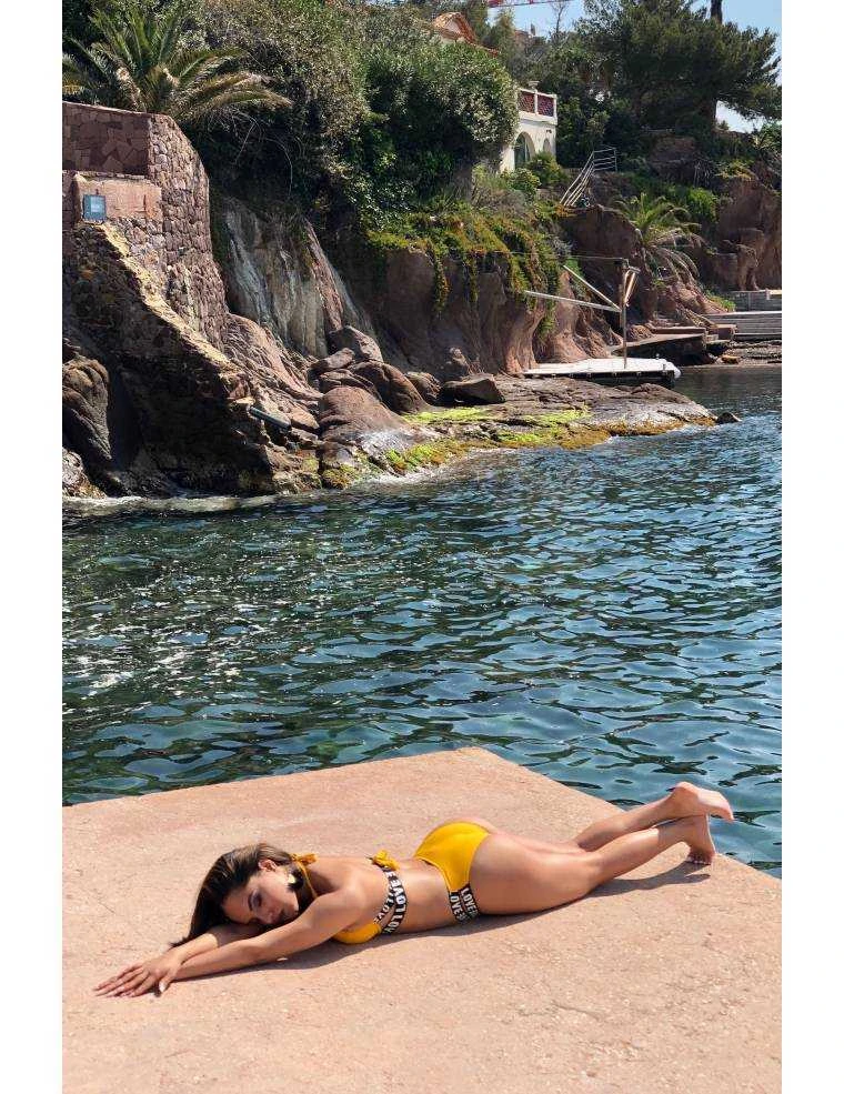 Maillot de bain push up deux pièces jaune, bandes elastiques noires imprimées LOVE