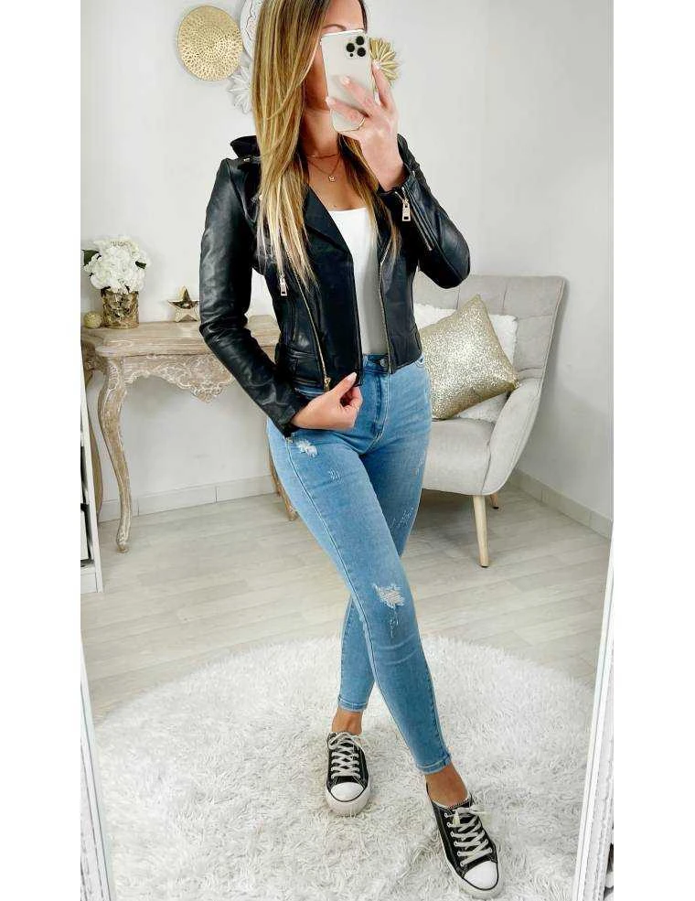 ☆ Perfecto noir style cuir, se ferme par un zip, capuche non amovible, il se porte ajusté.