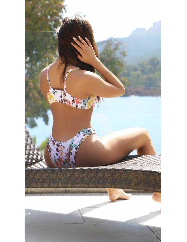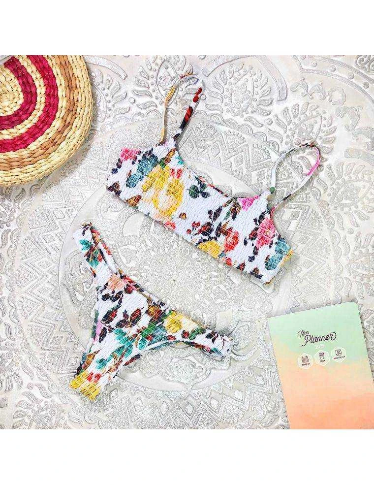 Bikini deux pièces blanc imprimé fleuri, effet froncé. Cullotte échancrée style bikini brésilien.