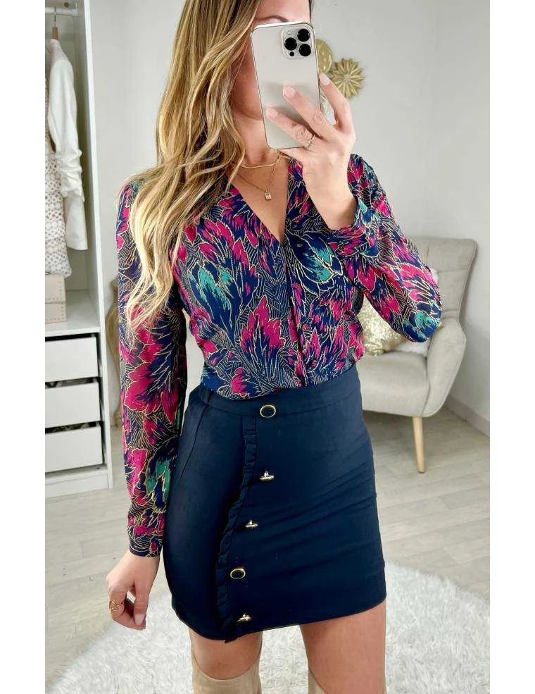 ☆ chemisier doublé (sauf aux manches) dans les tons fuchsia, bleus et liserés gold, col volants ,entièrement boutonné,il se porte droit.