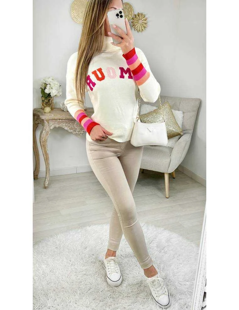☆ Pull tout doux cream & col roulé, inscription » Amour » , poignets dans les tons corail rouge et fuchsia,