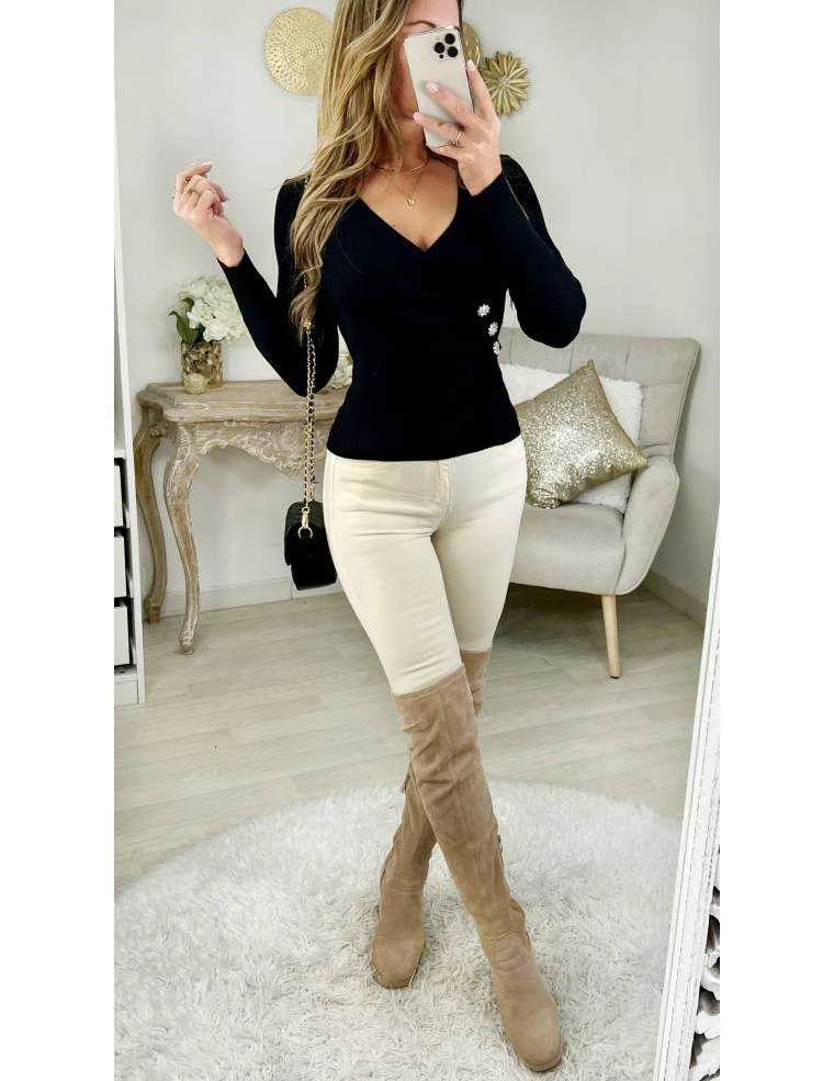 ☆ Pull côtelé noir,col cache coeur ,drapé sur le devant et trois boutons en strass,il se porte ajusté.