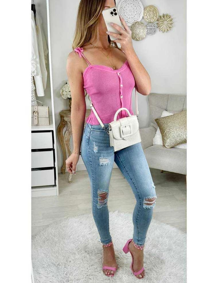 Petit top en maille rose ,quatre boutons, fines bretelles à nouer, il se porte moulant.