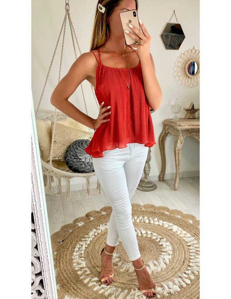 Top de couleur rouille plissé et volanté, fines bretelles et joli dos croisé, il est doublé