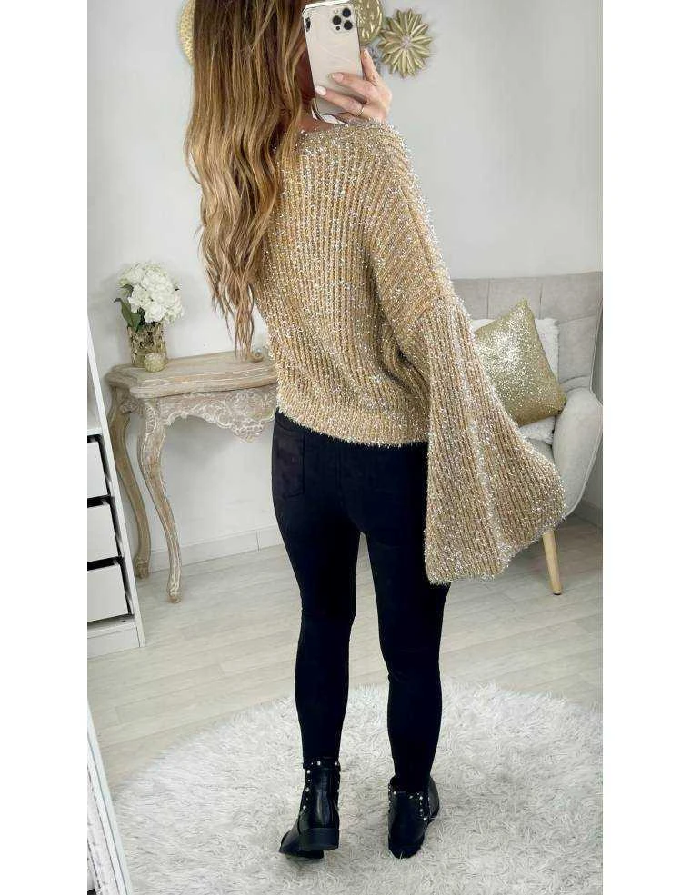 ☆ Petit pull caramel scintillant côtelé, manches longues ouvertes sur les avant bras, il se porte droit.