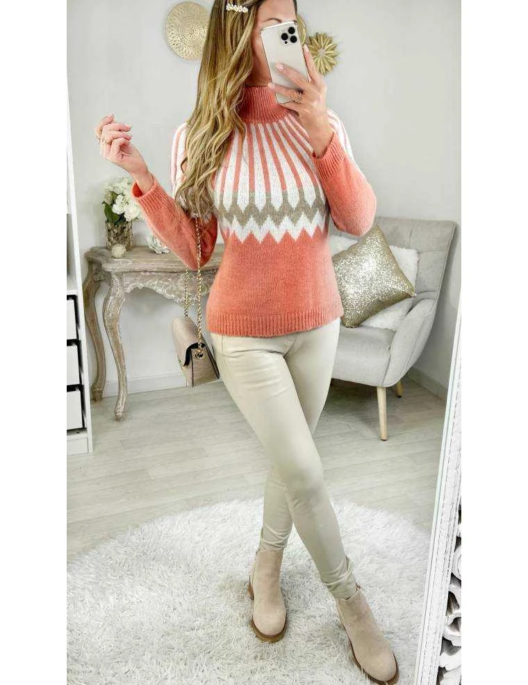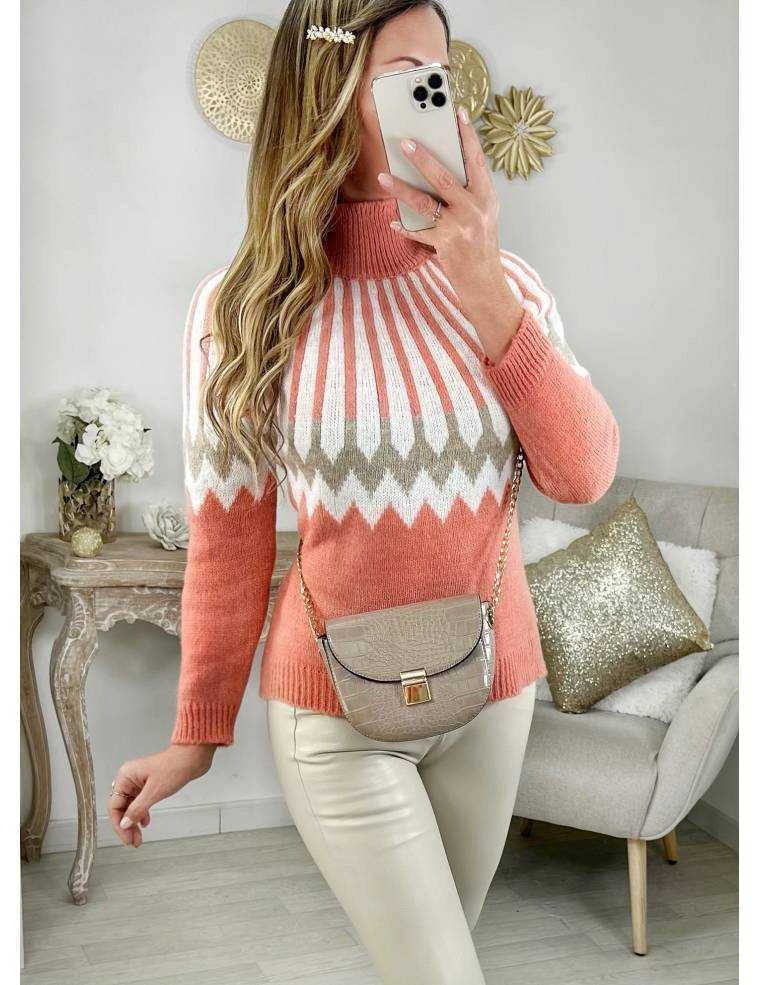 ☆ Pull col cheminée, tricolore: rose, beige et blanc, manches longues il se porte droit.