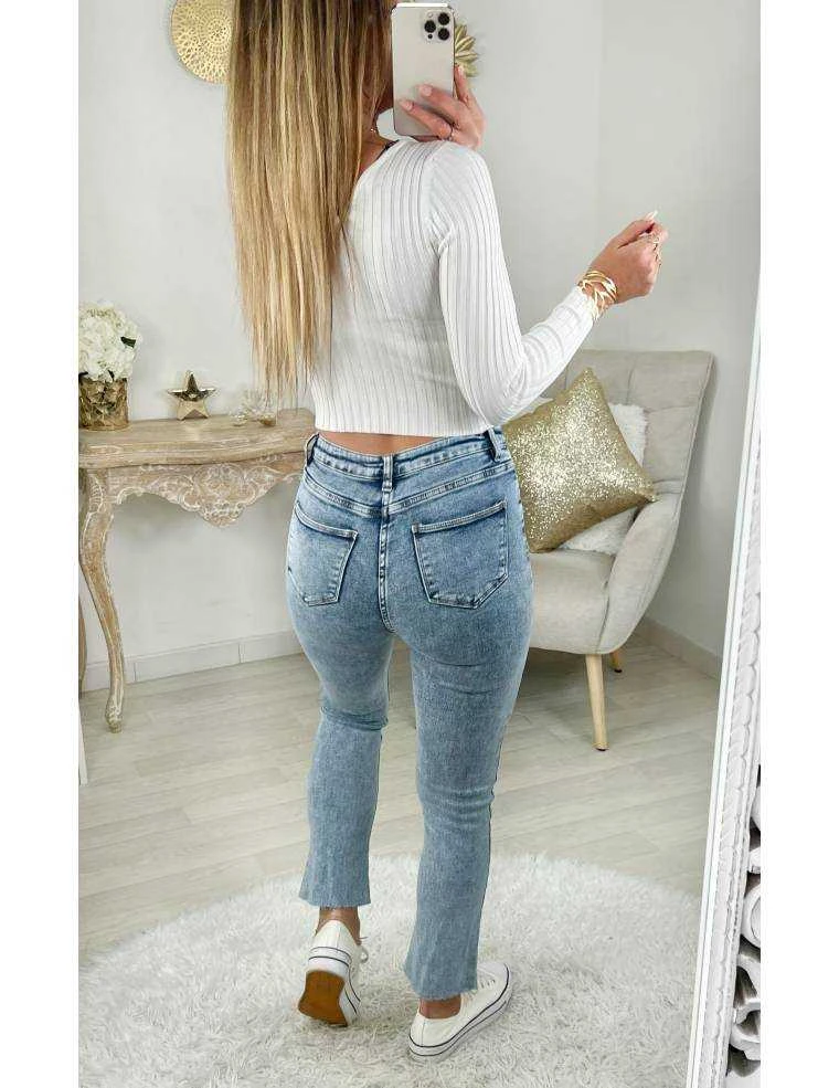 ☆ Pull côtelé blanc court, manches longues et col V il se porte ajusté