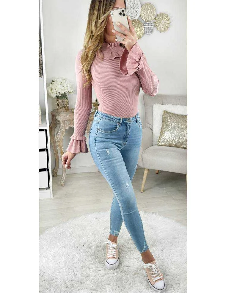 Pull rose pale en maille cotelée , col et poignets « volant » , il se porte ajusté