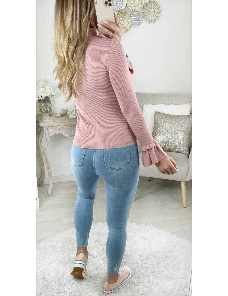 Mon Pull En Maille Côtelée Rose Pale « col Et Poignets Volants »
