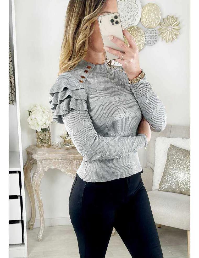 Pull gris ajouré et manches longues,volants sur les épaules et quatre boutons dorés sur chaque épaule il se porte ajusté