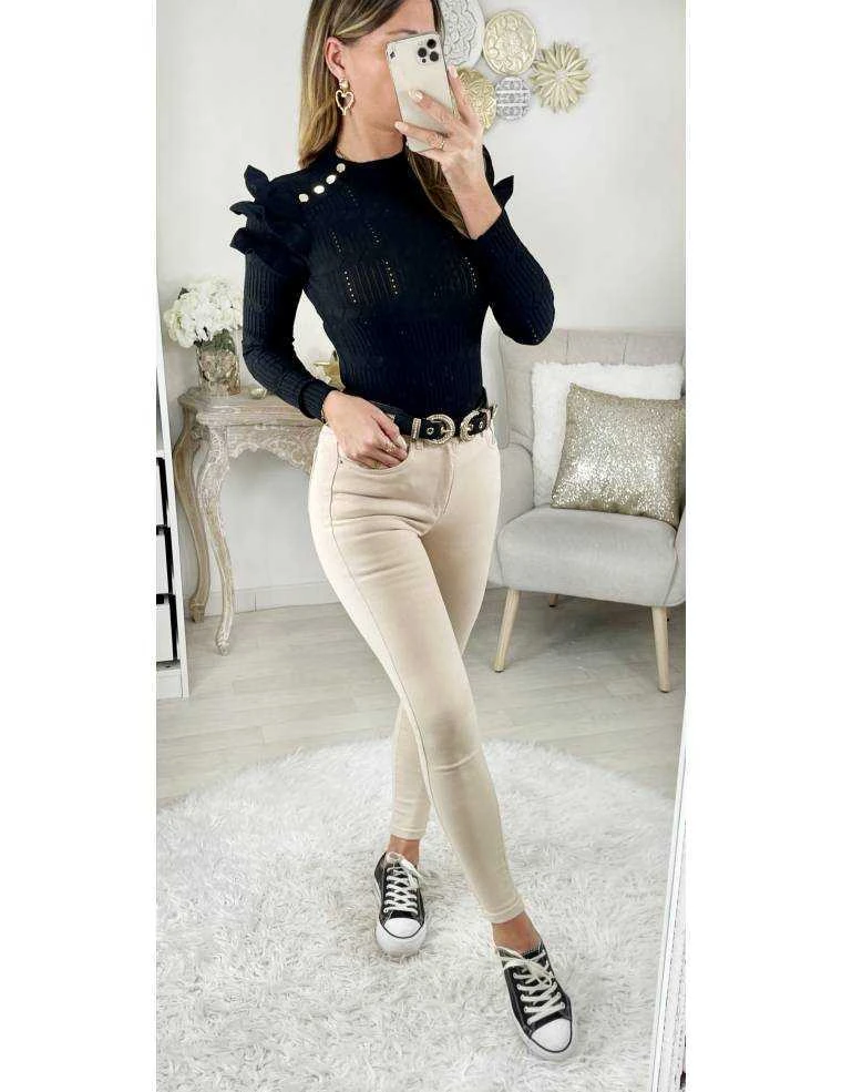 Pull noir ajouré et manches longues,volants sur les épaules et quatre boutons dorés sur chaque épaule il se porte ajusté
