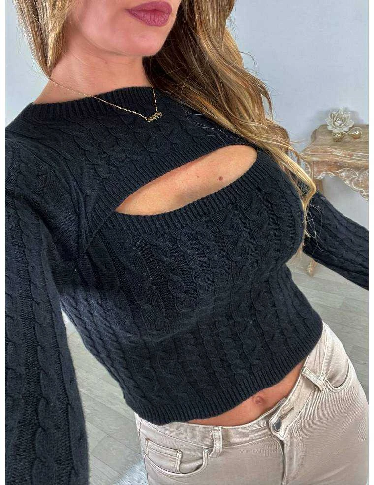 ☆ Pull court noir côtelé et torsadé, effet deux pièces, il se porte ajusté.