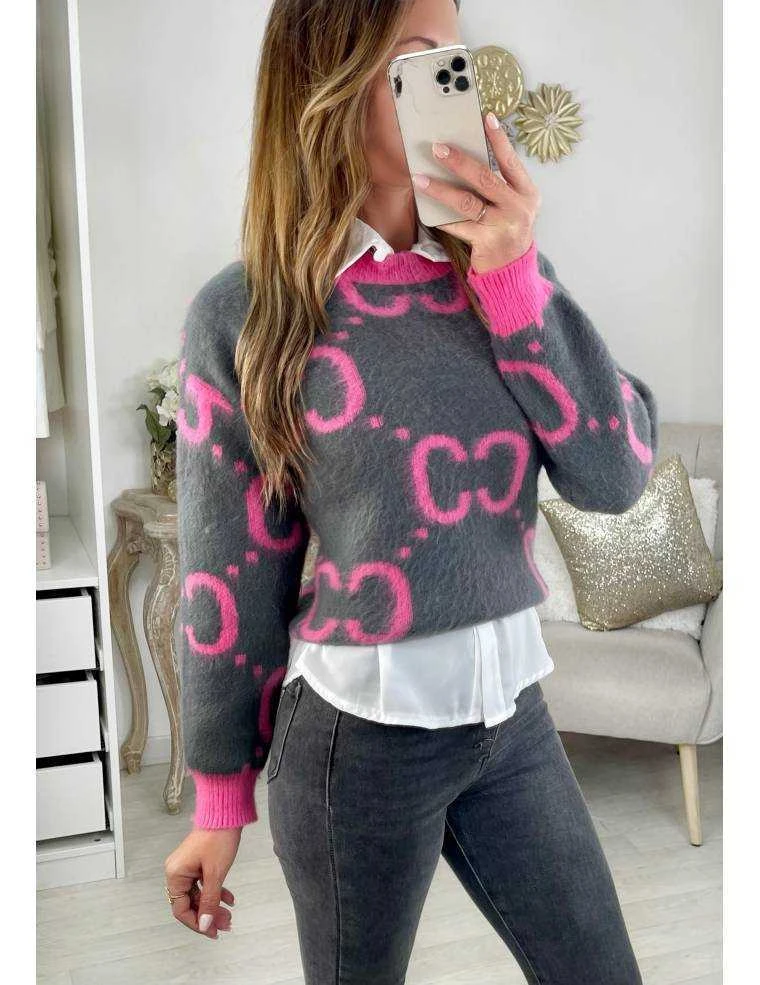 ☆Pull tout doux gris, col rond et imprimé rose » Inspi »