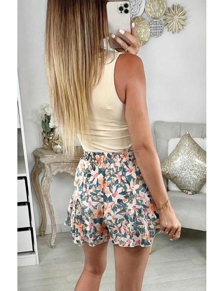 ☆ short au fond vert d’eau et imprimé fleuri, taille élastique, volants et tissu fluide