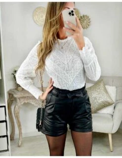 ☆ Top blanc tout doux tout en broderie, col rond, manches longues, bas festonné, elle se porte droite ou plus ajustée à l’intérieur d’un pantalon ou d’un short.