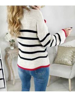 Pull en maille rayé, fond beige et rayures noires, touche de rouge sur le bas, col rond et manches longues, il se porte loose.