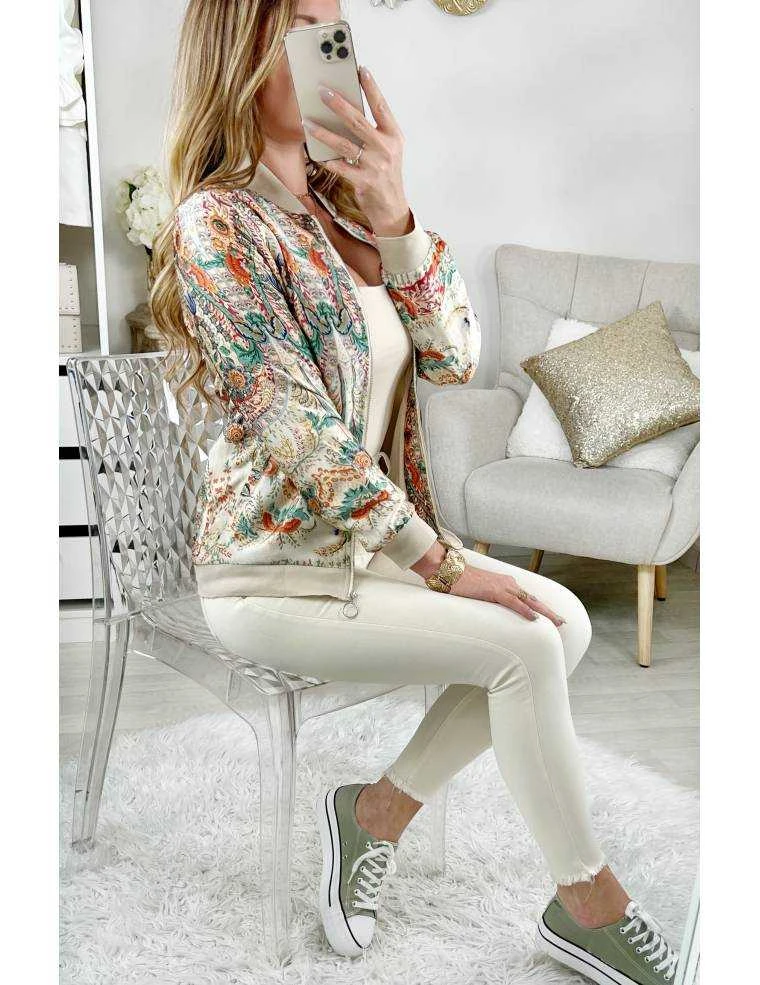 Teddy léger et imprimé dans les tons beige & orangé « cachemire », resserré sur les manches et sur le bas, se ferme par un zip à l’avant et se porte droit.